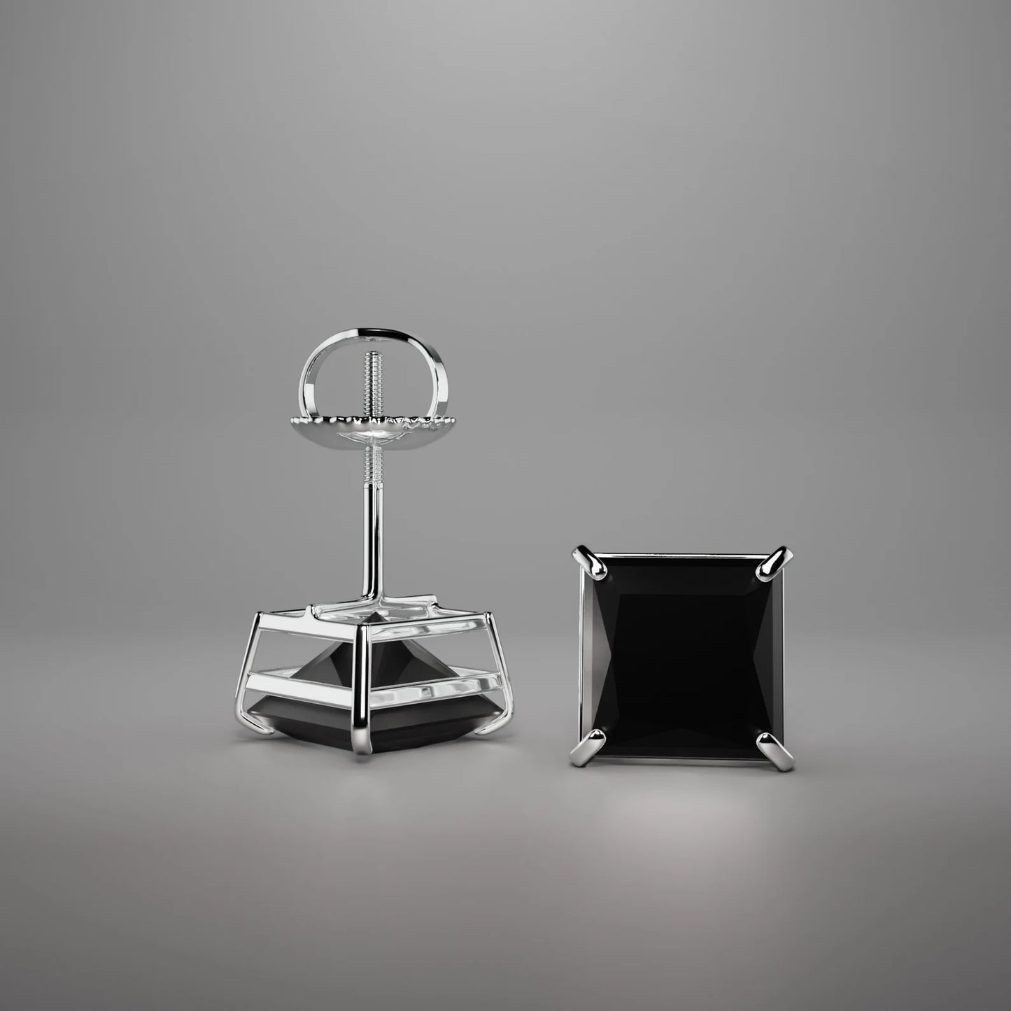 This product features stunning Princess Cut Black Simulants Diamond Stud Earrings in 14K White Gold with a secure Screw back 14K Stamped fastening. The simulated/created diamonds have a VVS clarity and the setting is a heavy 4 prong double basket design for added durability. The earrings are made with high-quality 14K .585 Europe white gold and are AAA rated for excellent settings quality.